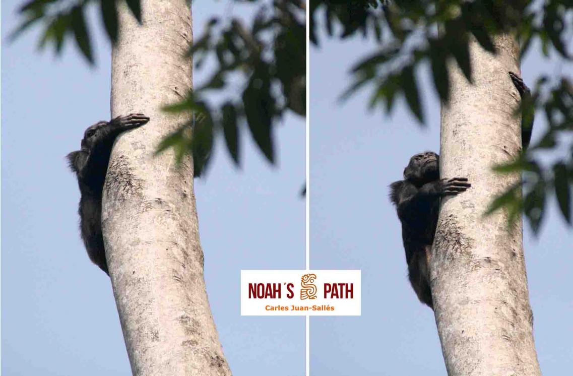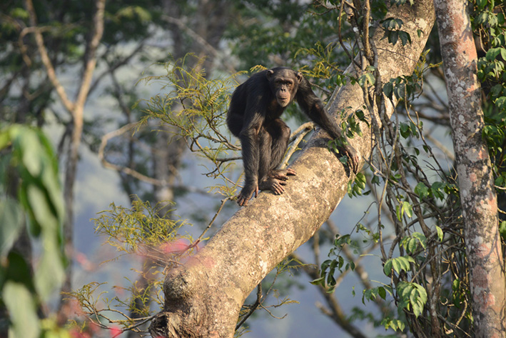 Chimpancé rehabilitado en los árboles del santuario